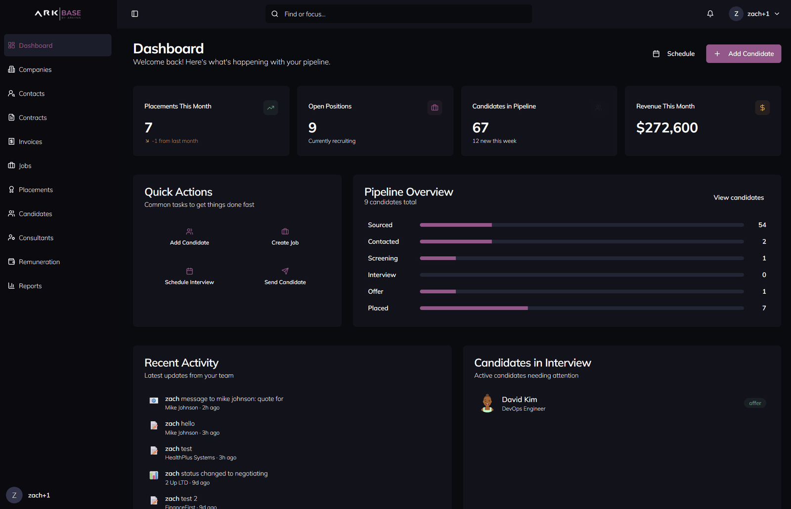 Arkbase brings clients, contacts, jobs, candidates, placements, contracts, invoicing, and team workflows into one focused system. Built for modern recruitment firms that want structure without heavy enterprise bloat.
